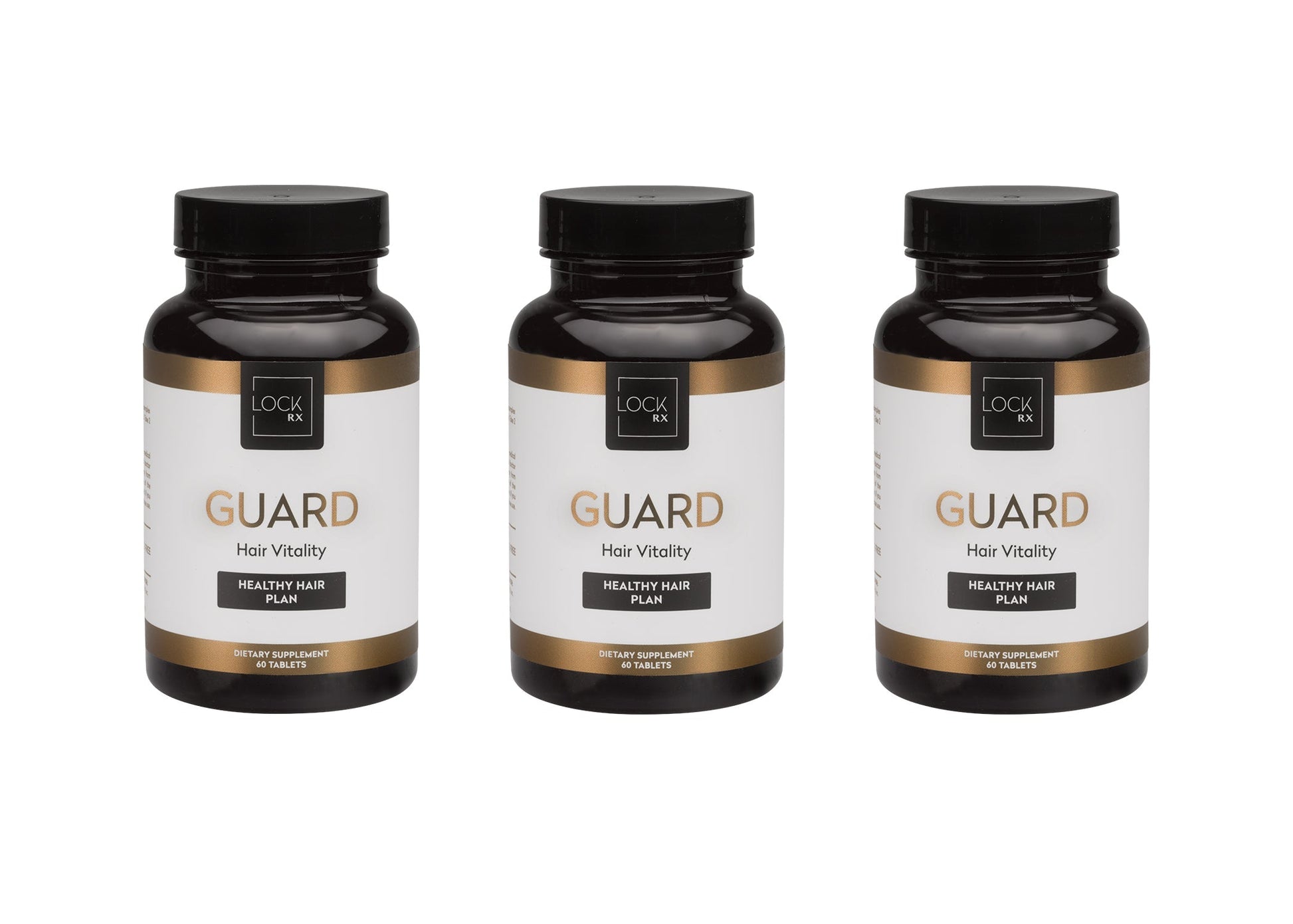 What It Is: GUARD is a follicle enrichment supplement formulated with the LOCKrx proprietary blend to support healthy metabolism of hair, skin, and nails. Physician designed and pharmaceutical grade, the elements in GUARD are formulated to address total body inflammation through gut health and the nutritional factors that may play a role in hair growth and shedding. These ingredients include multiple B vitamins and biotin, which have been shown to be some of the most important factors in maintaining hair vitality and supporting structure and color.