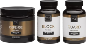 This ingestible Hair Support System was formulated to address total body inflammation through gut health and the nutritional factors that may play a role in hair growth and shedding. The Healthy Inside System consists of DEFENSE, a flavored powdered nutrient and two oral supplements: BLOCK & GUARD.